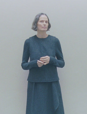 Skirt made from mottled boiled wool, featuring front pleats and a gently draped asymmetrical wrap panel. With dart shaping at the back and a grown-on waistband, finished with in-seam side pockets and raw, lapped seams.