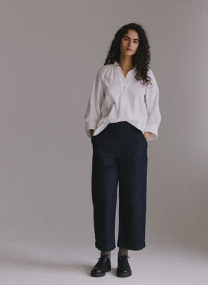 Our effortless shirt is made from cotton oxford which is comfortable against the skin. Shaped with a band collar and raglan sleeves, with delicate gathers.