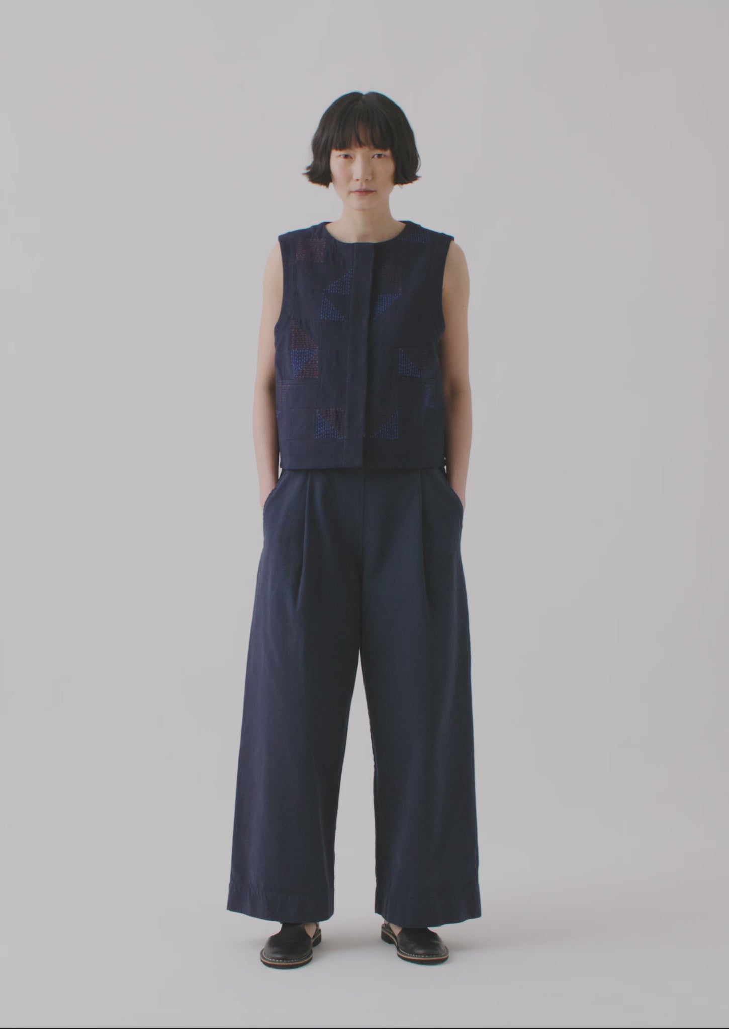 Our pleat front trousers are made from a soft organic cotton canvas. The trousers are garment-dyed, a process that gives each piece a natural colour variation. Shaped with knife pleats at the waist and buttoned waist tabs, inspired by workwear styles.