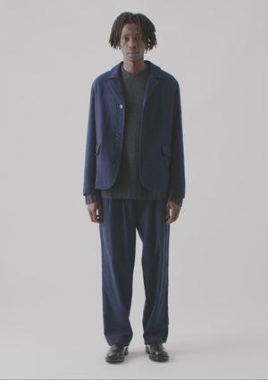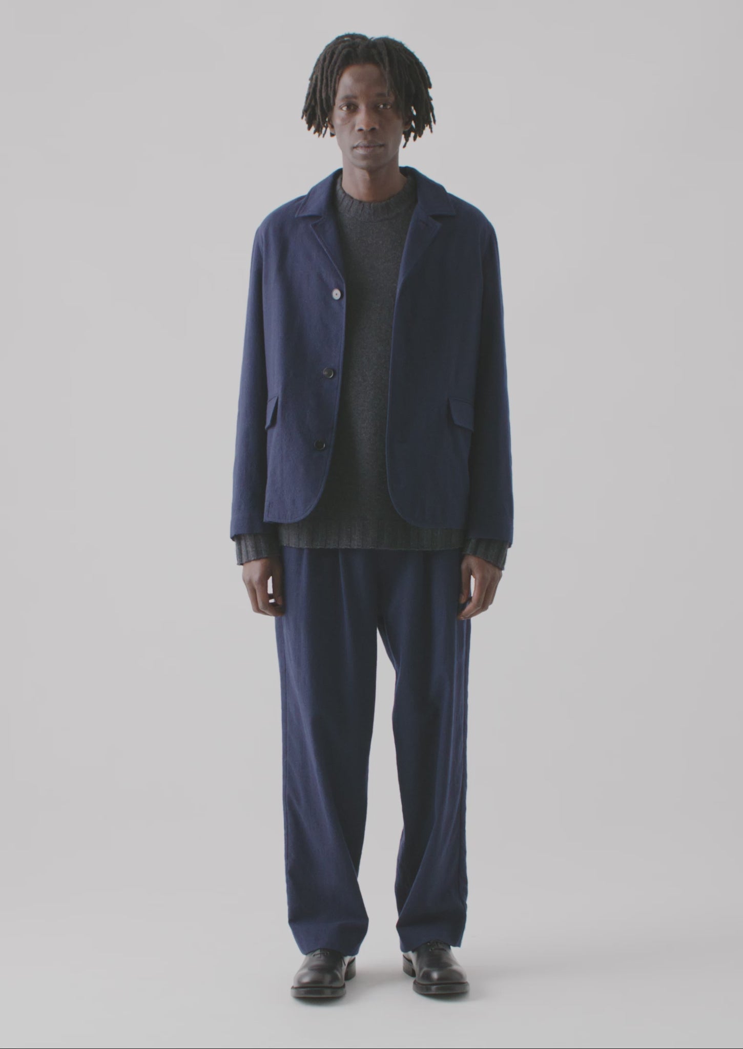 Made from organic cotton blended with wool, our jacket is woven with micro houndstooth texture. The collar can be styled open as a revere or buttoned for a clean silhouette. Finished with horn buttons, it features an internal welt pocket and two front flap pockets. Fully lined for a soft drape. Can be worn separately or as part of a suit with our Bill Houndstooth Cotton Wool Trousers. Part of our Menswear collection.