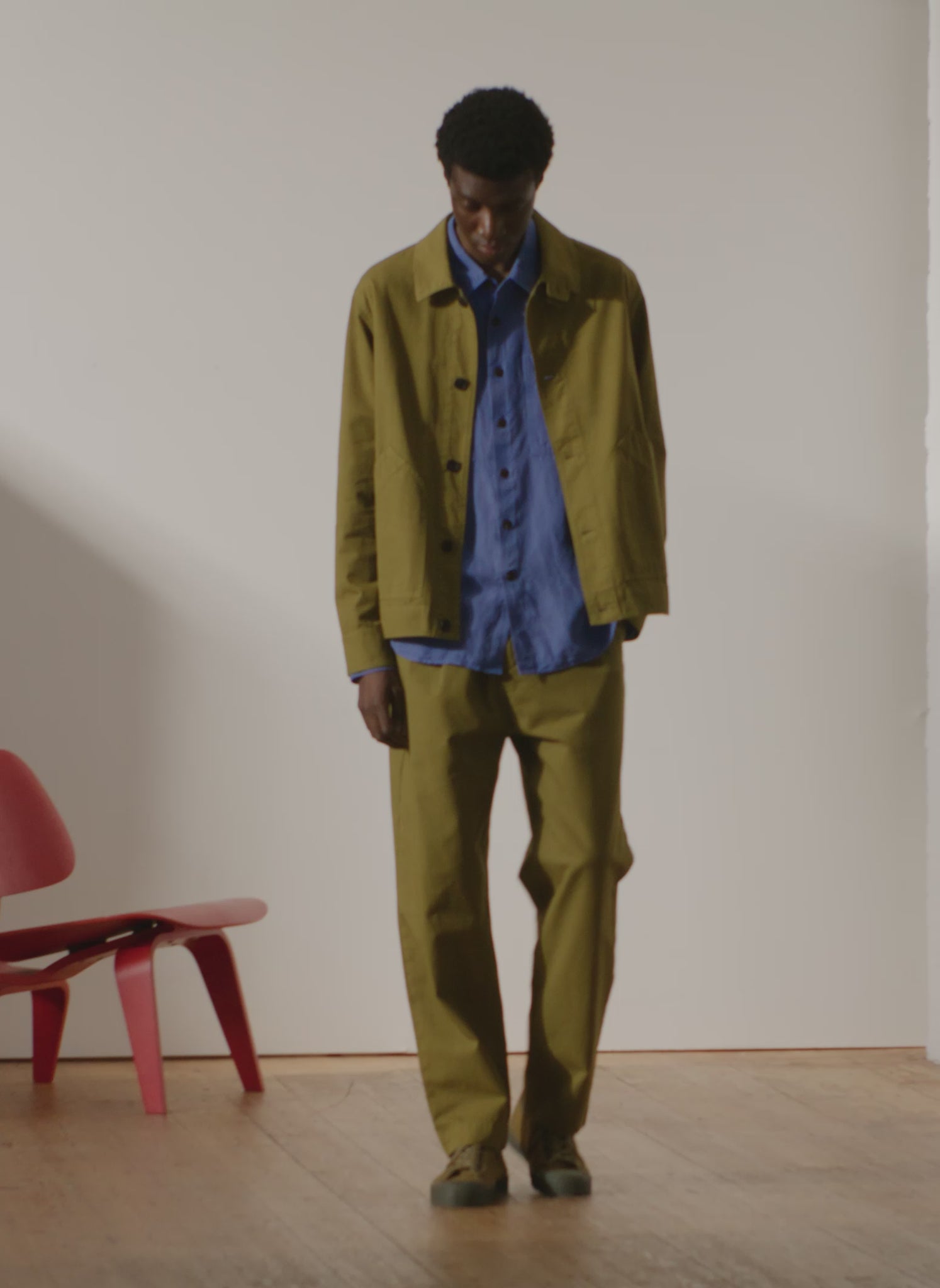 Organic cotton. Garment-dyed. Side slant pockets. Back welt pockets. Belt loops. Front horn button and zip.