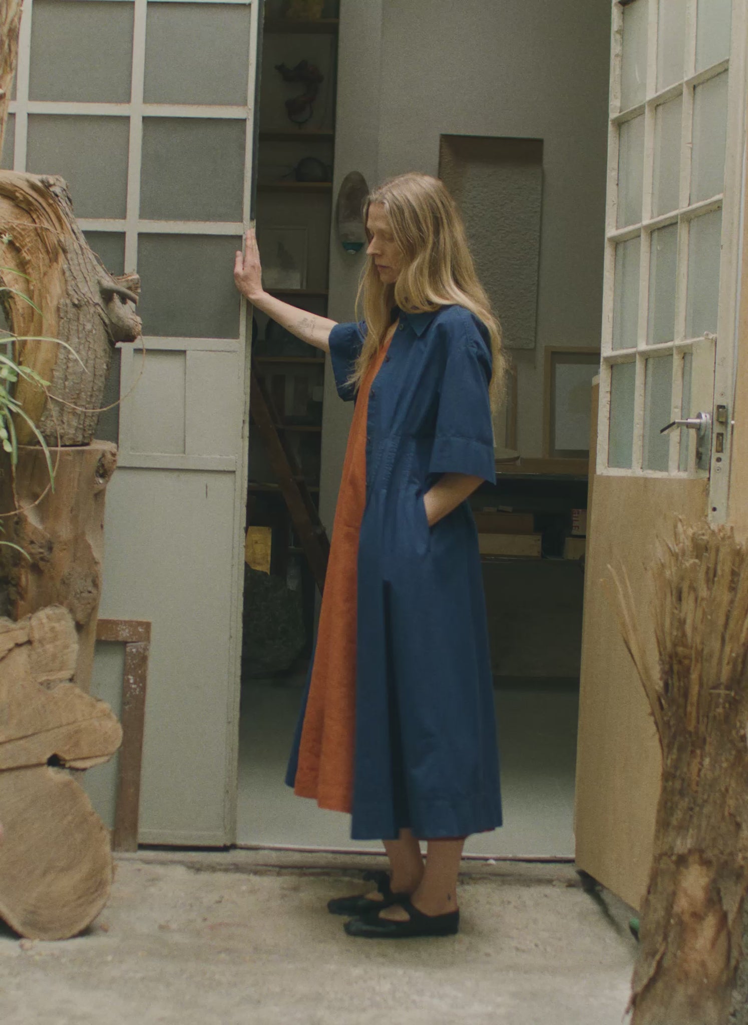 Our easy cotton linen dress features external box pleats at the waist and a wide hem, creating a fluid sense of movement. With dropped shoulders, a shirt collar and elbow-length sleeves. The concealed placket maintains an effortless finish.