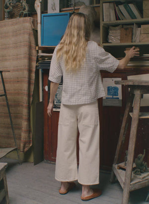 Our wide leg trousers are made from regenerative denim grown in Türkiye. Our regenerative cotton is grown in Türkiye without harmful pesticides, improving soil health and farmer well-being. This method supports sustainable, high-quality denim production with minimal environmental impact. Sitting on the hip, this weighty denim defines the relaxed silhouette, complemented by slanted side pockets. Large patch pockets are inspired by workwear styles. Finished with twin stitching.